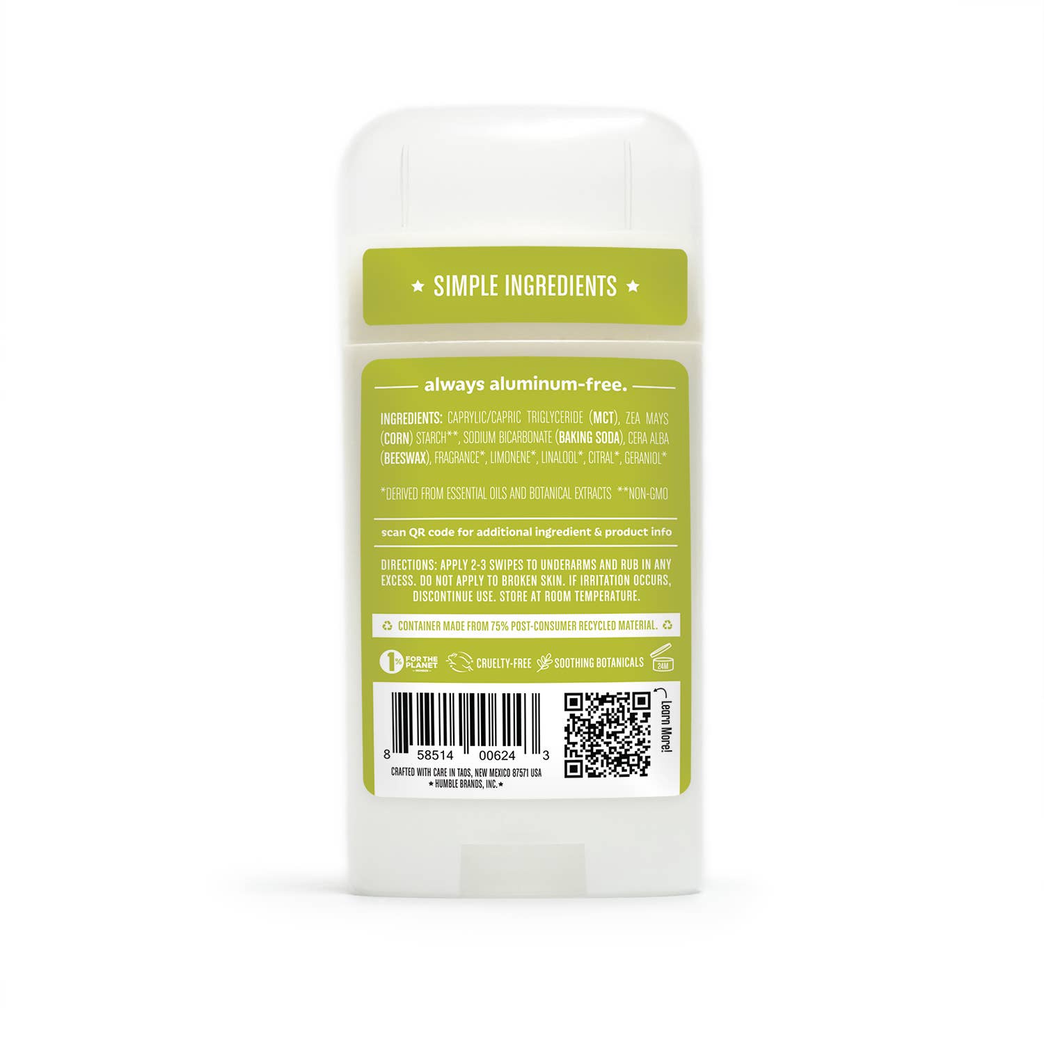 Product Description: Made with simple, highly effective ingredients (MCT oil, non-GMO corn starch, beeswax, baking soda and botanically-based scents). Humble Brands Deodorant is formulated to absorb and neutralize body odor. Humble Brands Deodorant has no aluminum, alcohol, dyes, parabens, sulfates or artificial fragrance. Certified Cruelty-Free by Leaping Bunny and a 1% for the Planet product that gives back with every purchase. Full size deodorant containers are made from 75% post consumer recycled plastic.