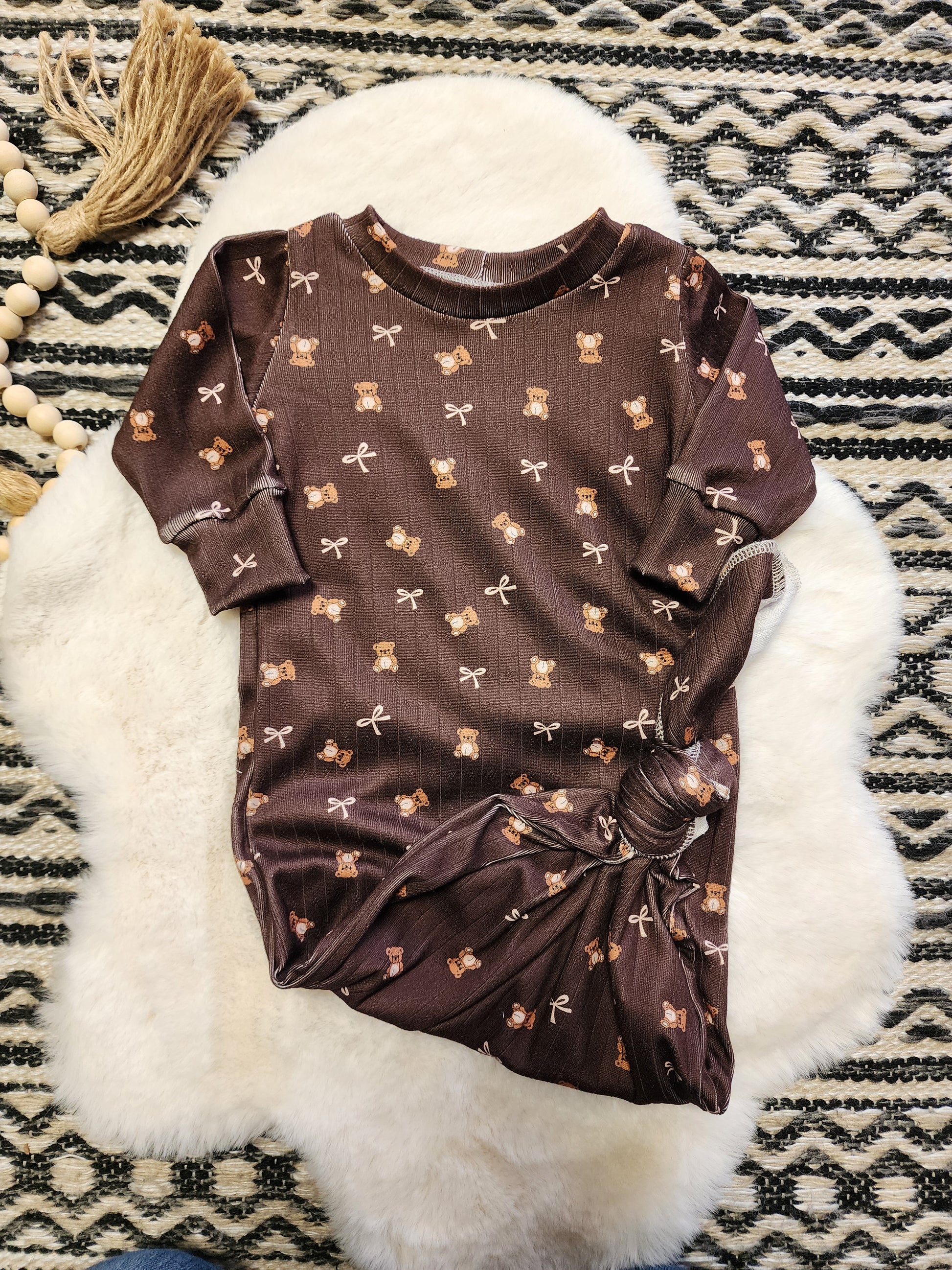Handmade knotted baby gown makes infant easily accessible for diaper changes and snuggles. Buttery soft and stretchy material perfect for your newborn. Comes in 0-3 month size, perfect for 7-13lbs