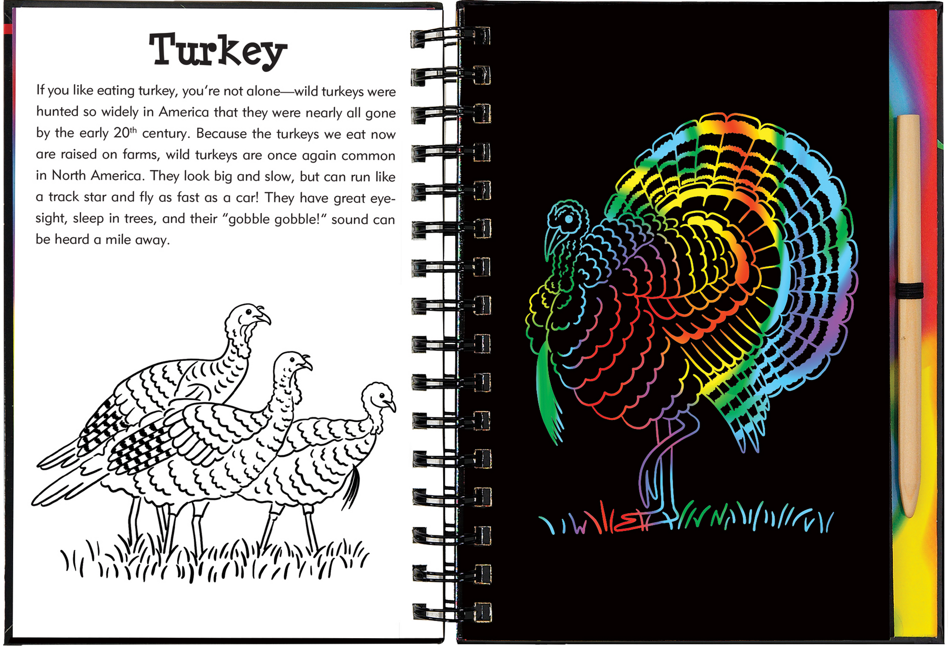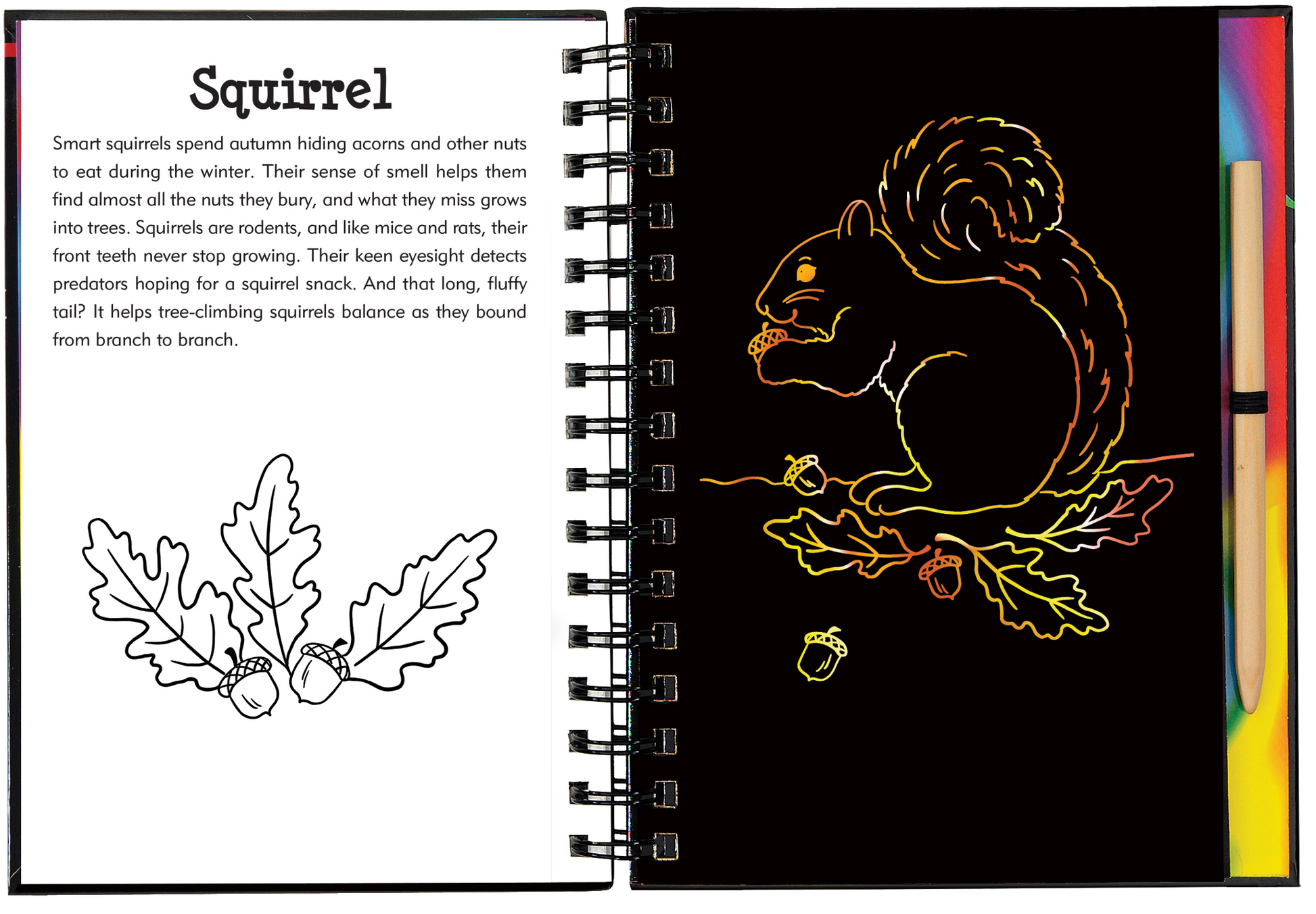Meet the animals that call the forest home as you scratch and sketch your way through these fun pages! Learn about bears, bunnies, owls, eagles, and other woodland creatures as you trace and draw with the included stylus to uncover sparkly gold, silver, and rainbow colors. This is a Trace-Along Scratch and Sketch ! White outlines on black scratch-off pages create a fun way for younger children (5 and up) to build confidence in their creativity as they reveal brilliant patterns, swirls, and colors beneath! They can also use the sketch pages in the back to draw their own pictures of favorite animals. Includes a wooden stylus for drawing on the black-coated pages. Includes 20 black-coated scratch-off pages, 20 illustrated pages with informative text, and 20 extra pages for independent drawing and sketching. Suggested ages: 5 and up. Sturdy wire-o hardcover binding.