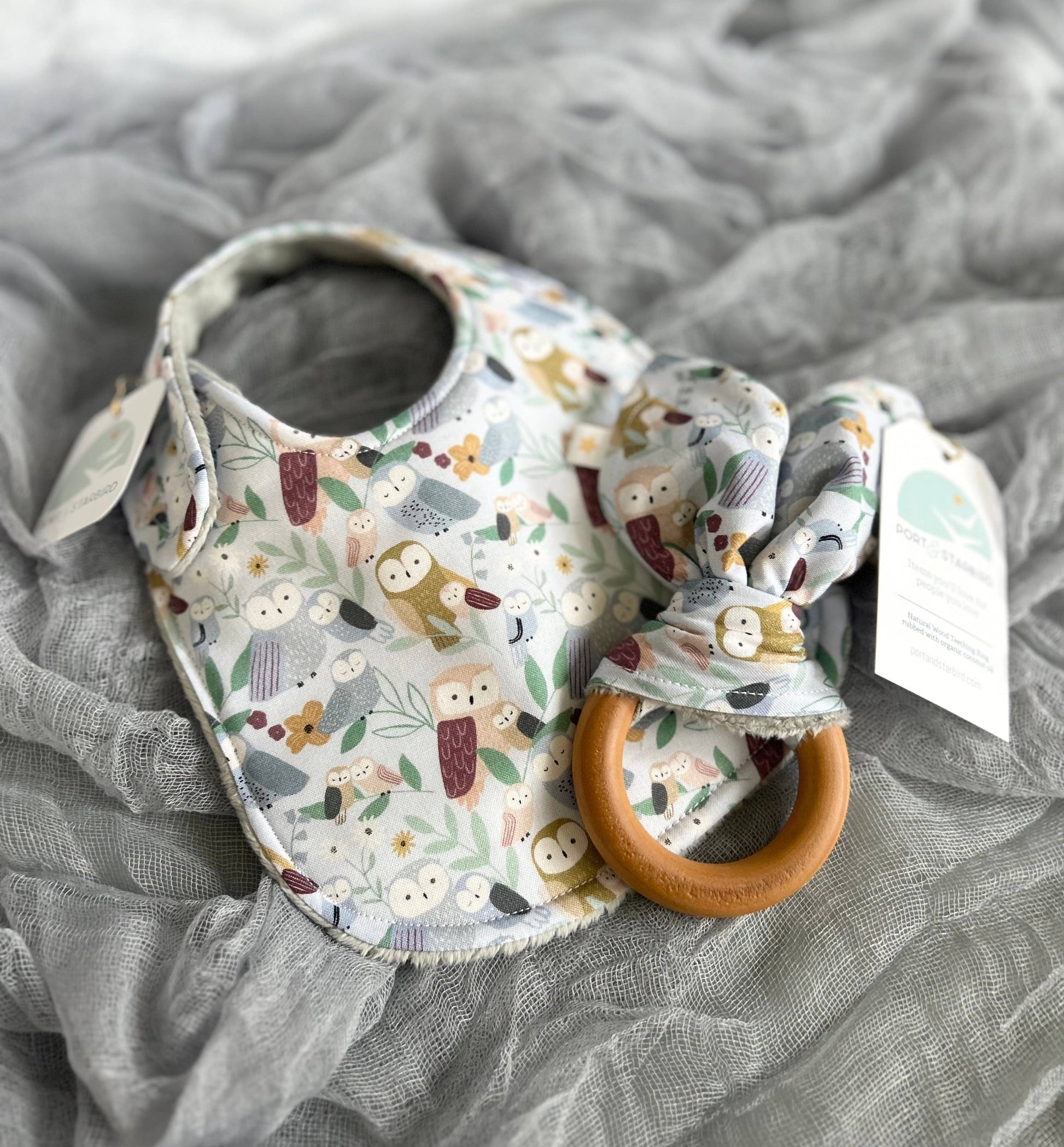 This toy does double duty! Each bunny ear looped fabric is backed with super soft snuggle fabric and has baby *crinkle paper sewn in for added sensory play.(Every wooden ring is rubbed in a small amount of organic coconut oil)