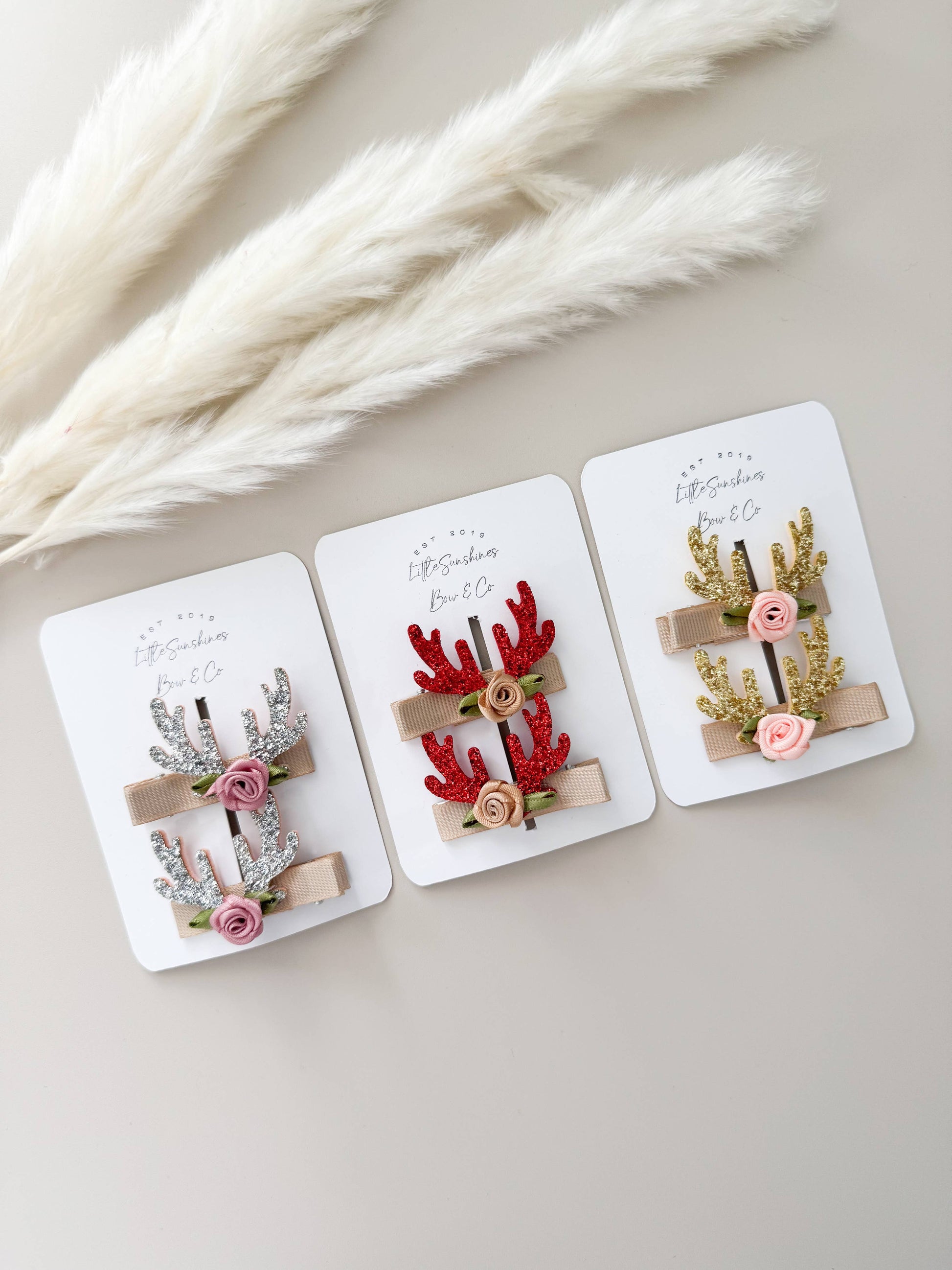 Glitter Antler & Satin Flower Hair Clips- Set of 2 : Red Antler Set