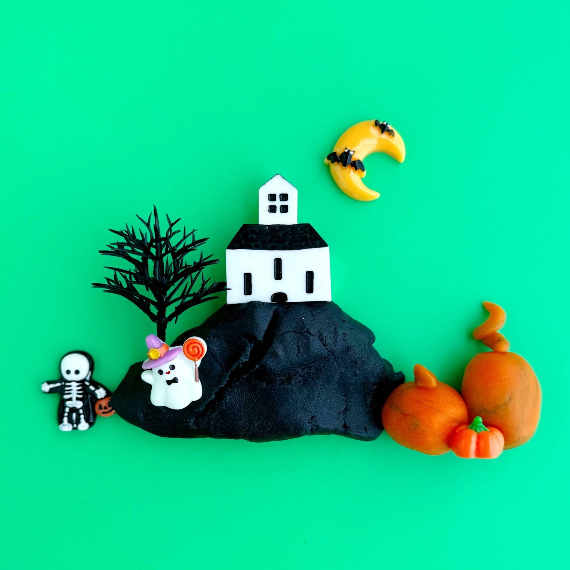 Includes: 2.5 oz Orange (Halloween Candy) KidDough, 2.5 oz Black (Halloween Candy) KidDough, Ghost and Skeleton Trick or Treater Charms, Haunted House Figurine, Spooky Tree, Crescent Moon Charm with Bats, Pumpkin Figurine