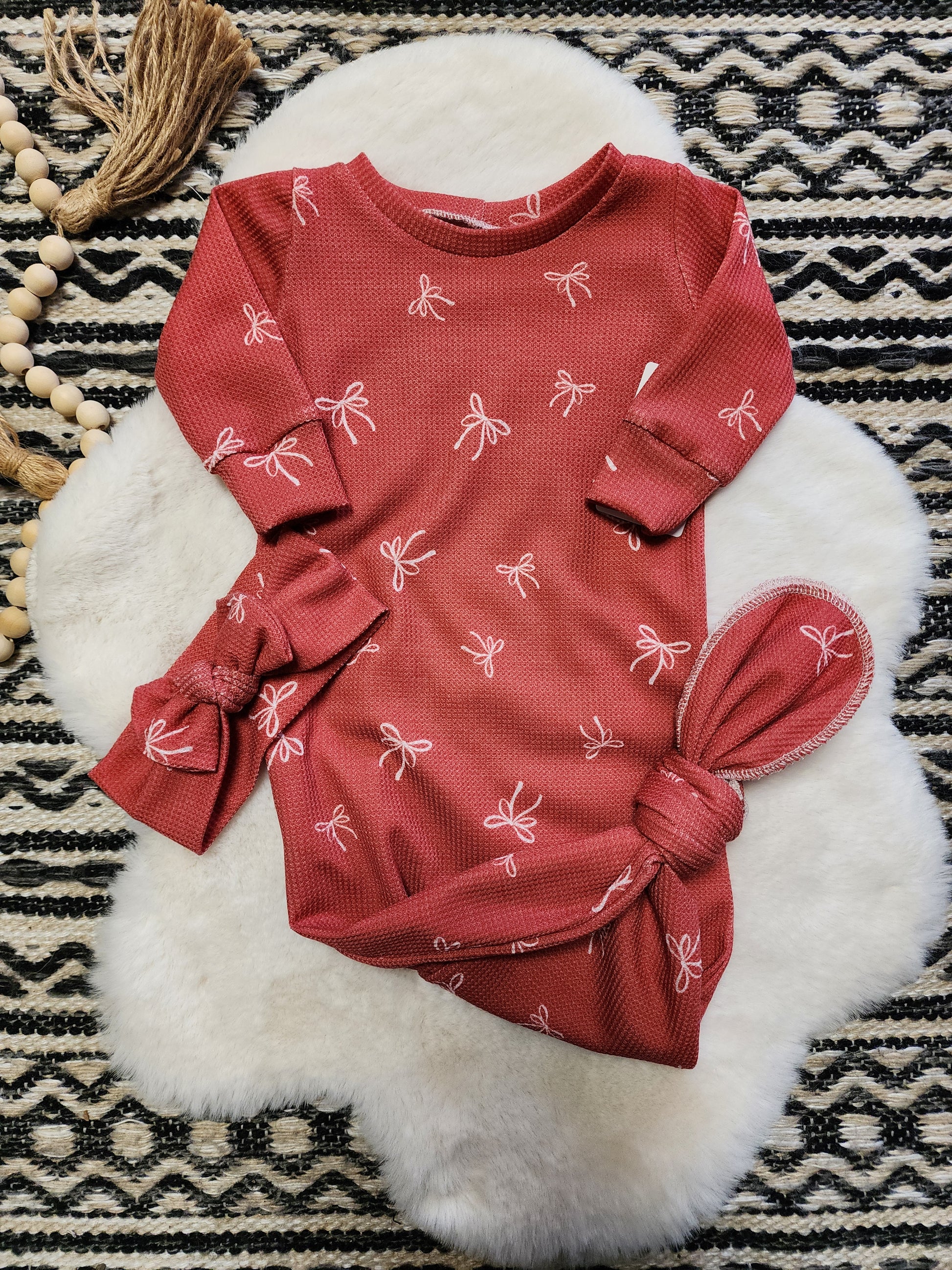 Handmade knotted baby gown makes infant easily accessible for diaper changes and snuggles. Buttery soft and stretchy material perfect for your newborn. Comes in 0-3 month size, perfect for 7-13lbs