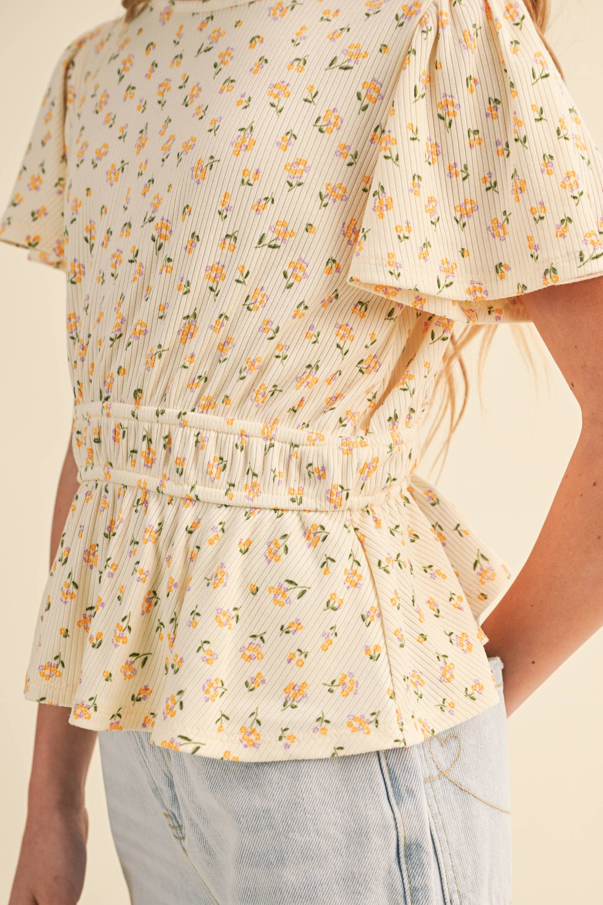 The short flutter sleeves add a soft, feminine touch, while the elastic waist creates a flattering peplum silhouette. Lightweight and breathable, this top is perfect for warm days and easy styling.