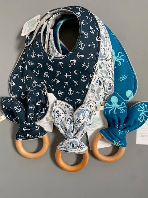 This toy does double duty! Each bunny ear looped fabric is backed with super soft snuggle fabric and has baby *crinkle paper sewn in for added sensory play.(Every wooden ring is rubbed in a small amount of organic coconut oil)